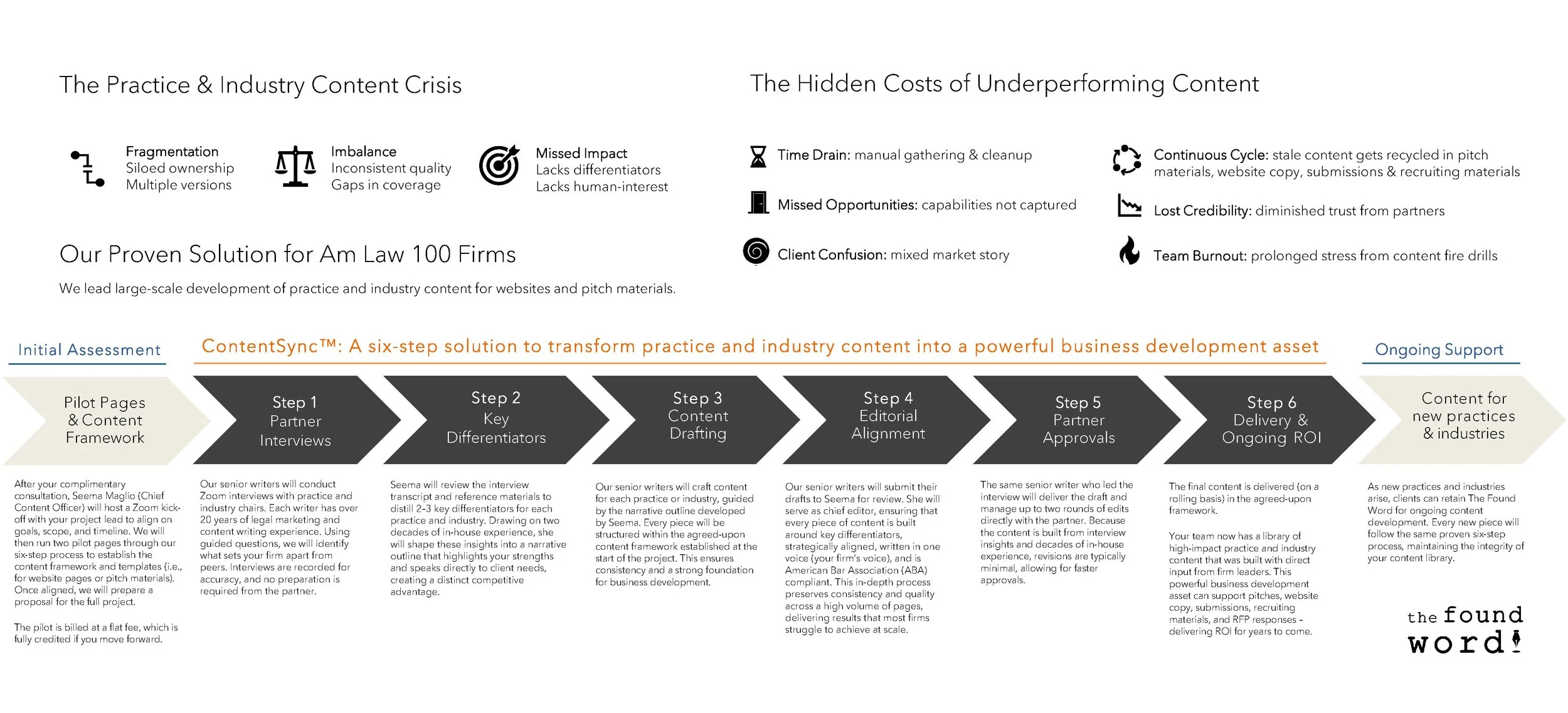 Our clients trust us because we don’t just write - we project-manage every step, including working directly with partners and other stakeholders. Through our six-step process, ContentSync™, we will transform your practice and industry content into a powerful business development asset - one that generates ROI for years to come.